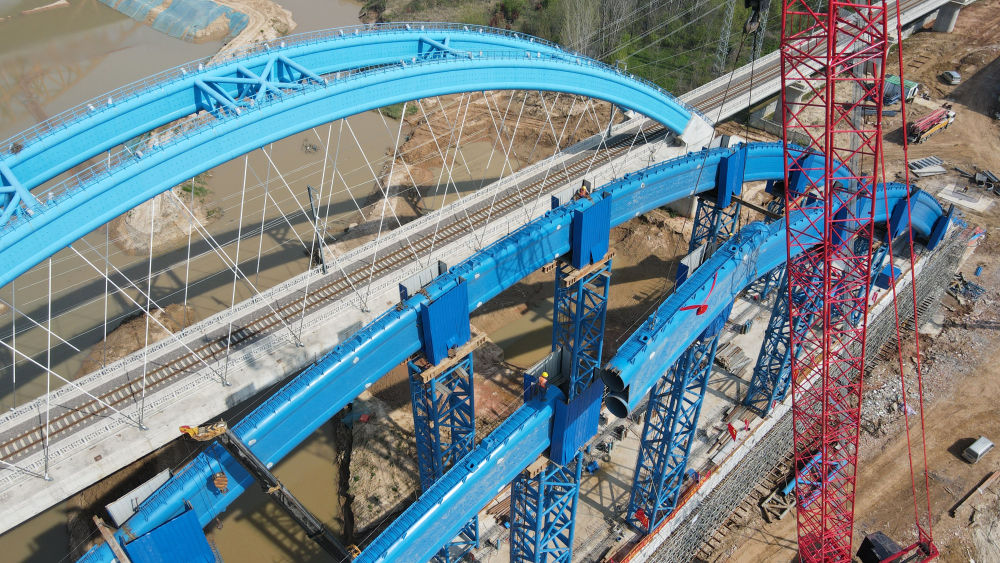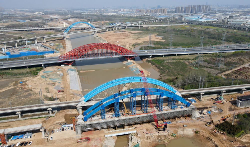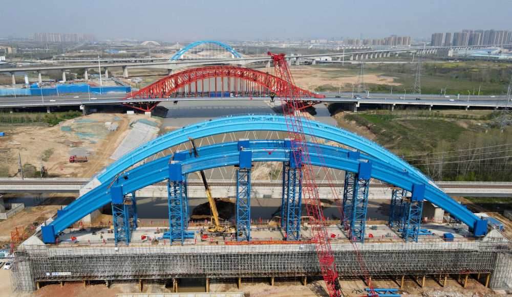 ↑這是中鐵四局引江濟淮合九鐵路改建工程特大橋系桿拱合龍施工現場(4月2日攝)。新華社記者 劉軍喜 攝影報道