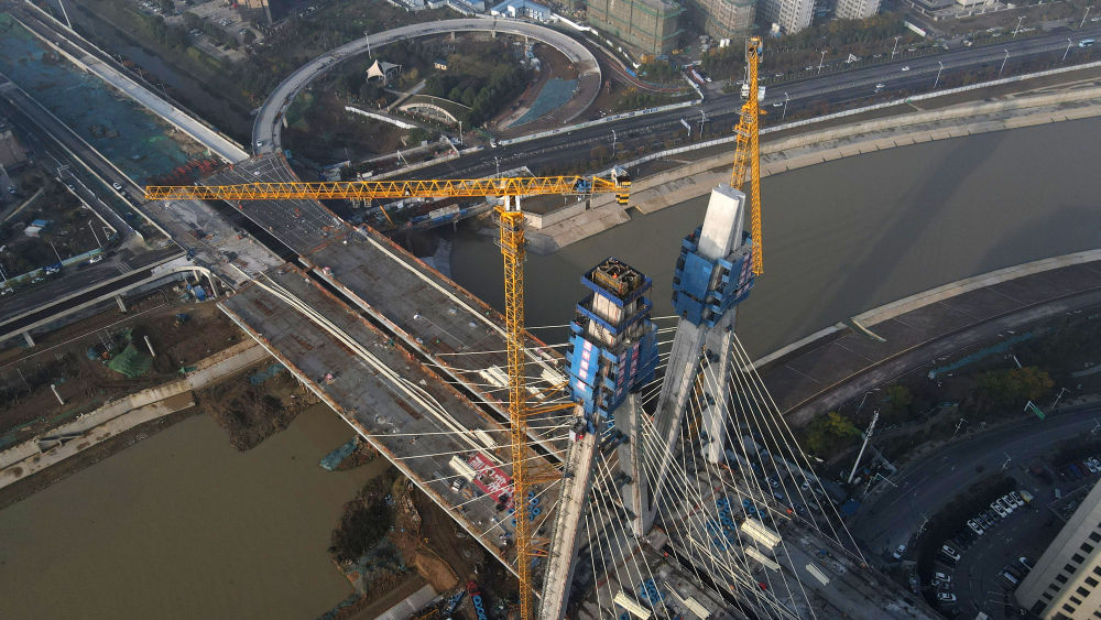 ↑這是正在進行主塔封頂施工的引江濟淮金寨南路橋(11月24日攝,無人機照片)。