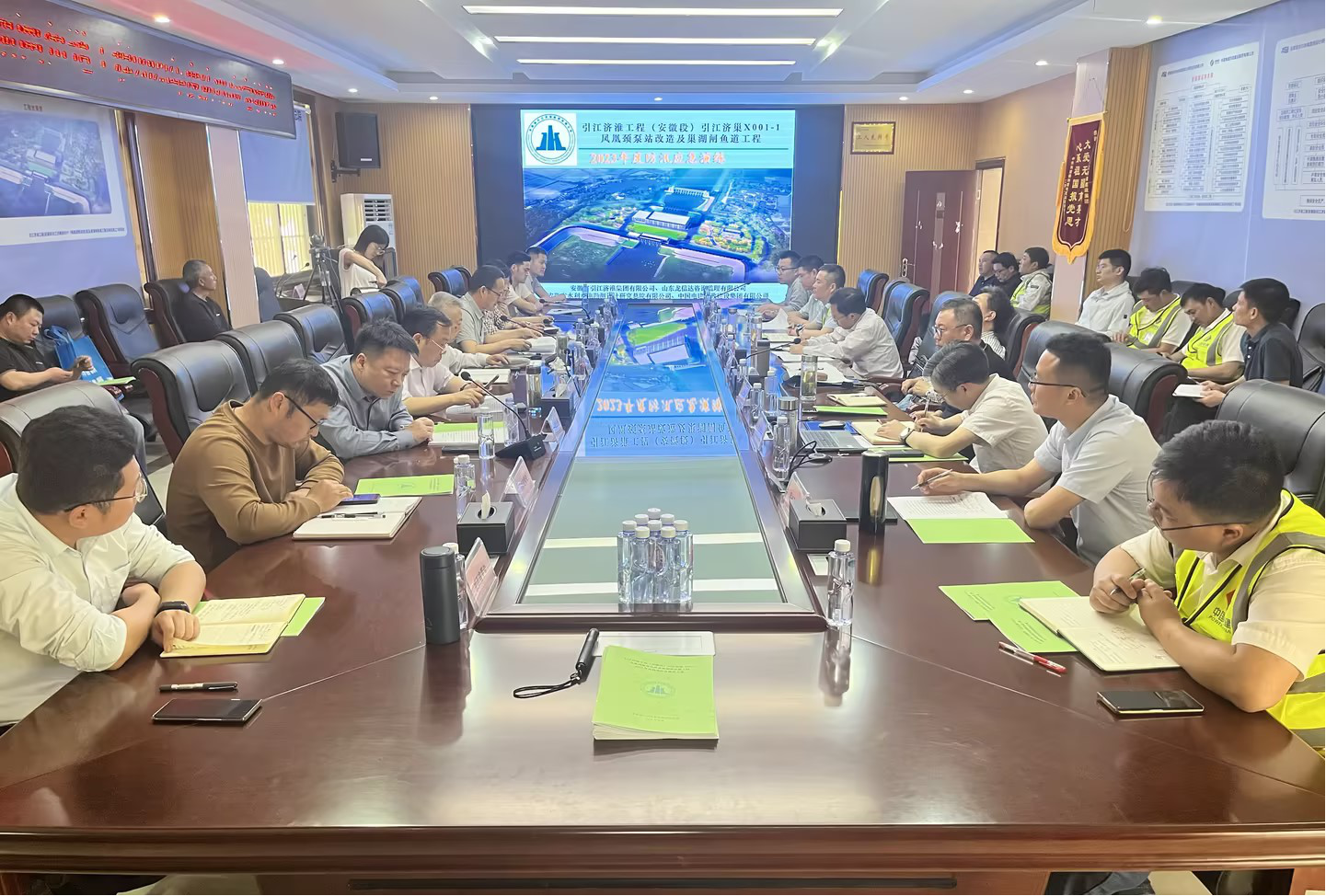 與會人員查看了鳳凰頸泵站工程,了解工程進展和度汛關鍵部位情況,隨后于會議室開展桌面演練,演練過程制定四個具體場景,模擬上游西河側、下游長江側水位上漲至某預定高程或長江側圍堰內副基坑、老泵站北側主基坑發現險情等工況,推演險情上報、會商決策、聯合調度、搶險救援等工作。演練結束后,與會人員進行了交流發言和演練點評。